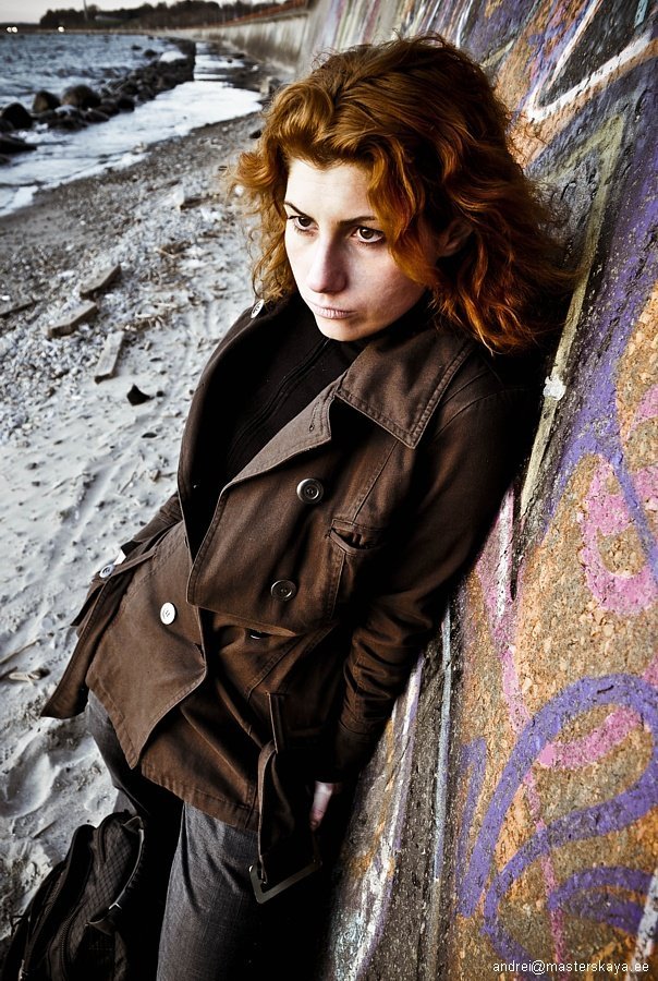 Съёмка проходила так: вечер, холодно, ветрено, я в дупель умотанный, ищу повод чтобы отмазаться (потому что уже обещал). Она – в схожей ситуации. Тем не менее, по-скорому приезжаем в Пирита, пару минут щелкаем на леденящем ветру и сразу по домам, греться и отсыпаться. На удивление несколько кадров вышли удачными.